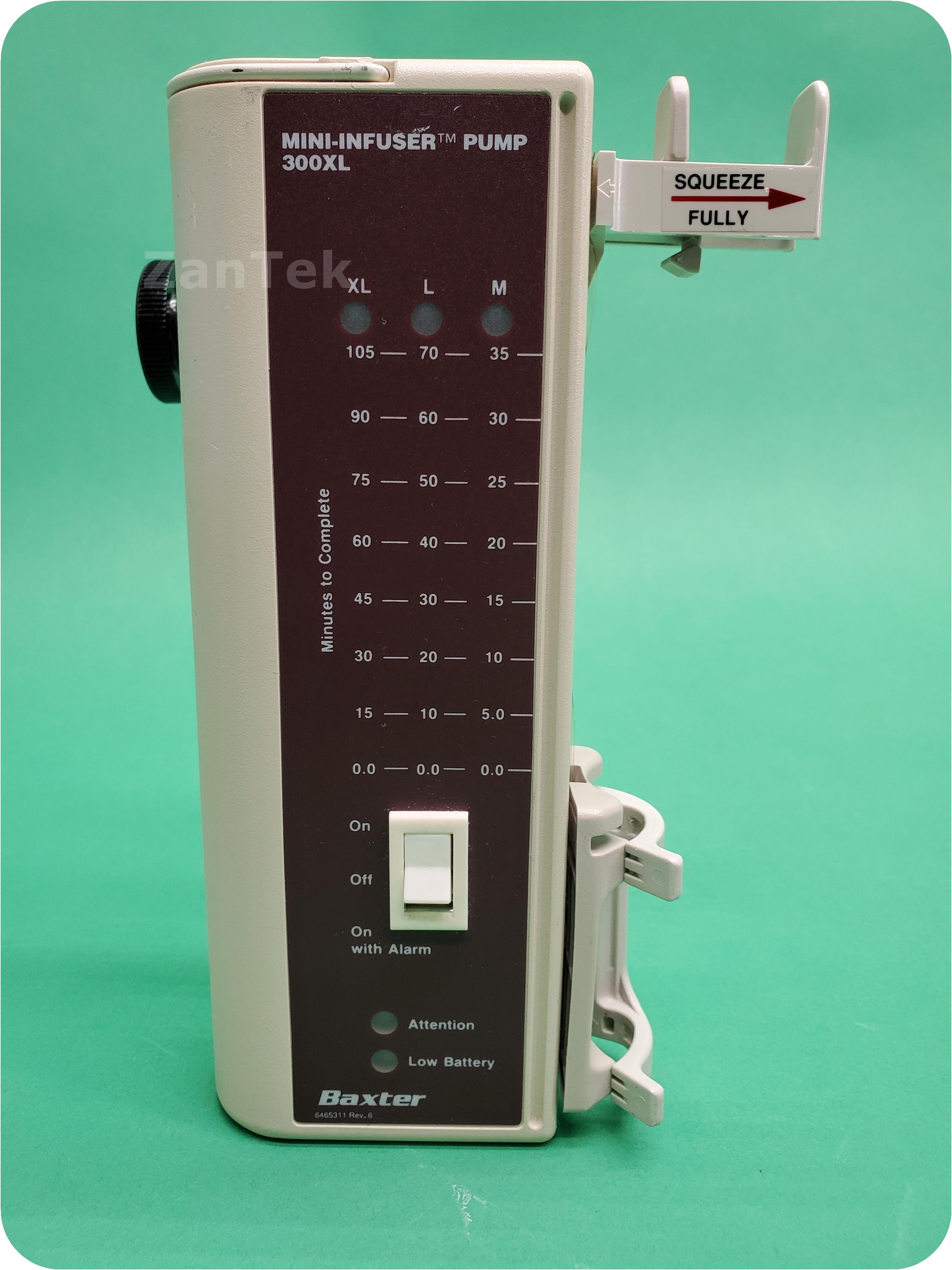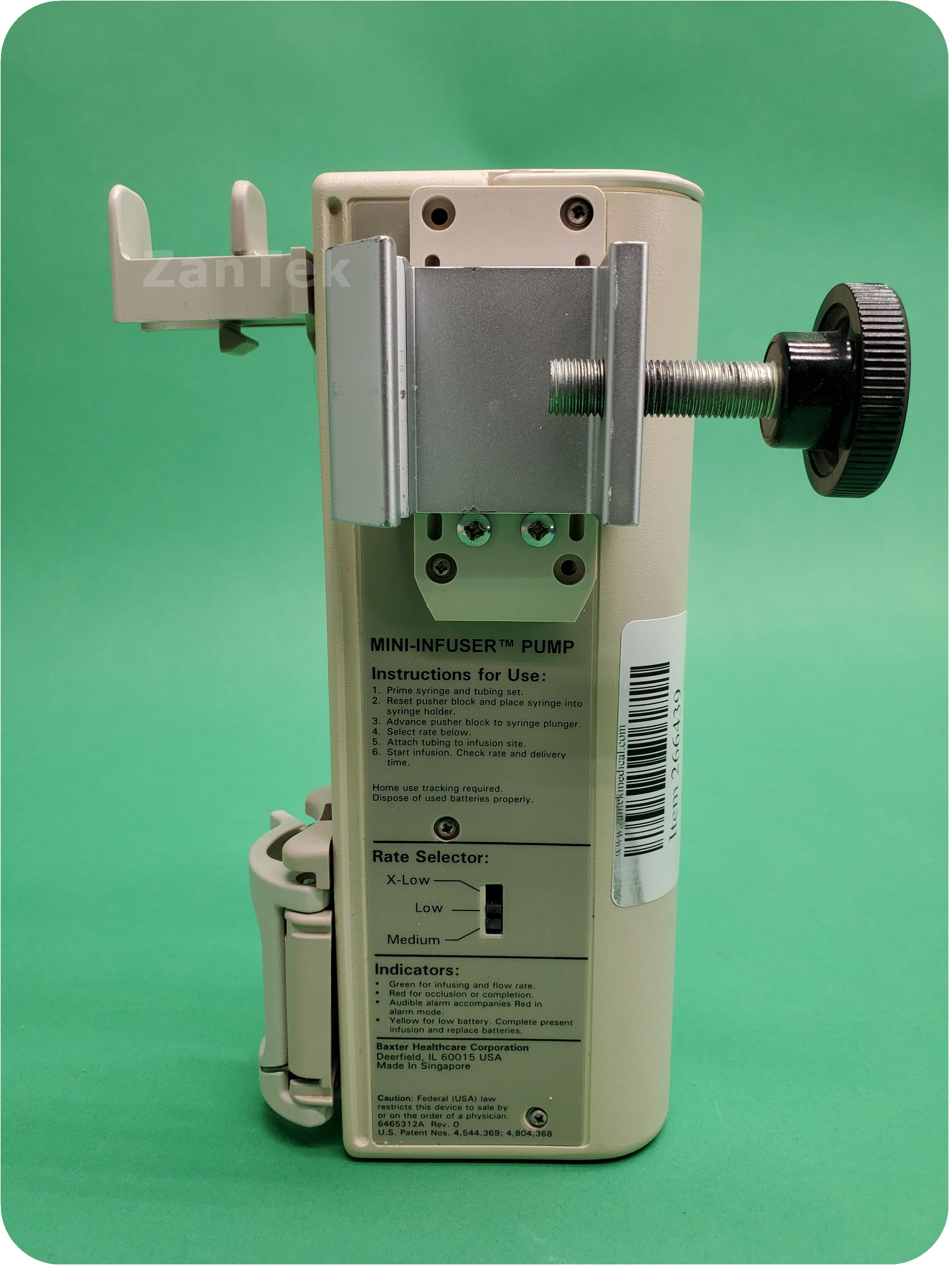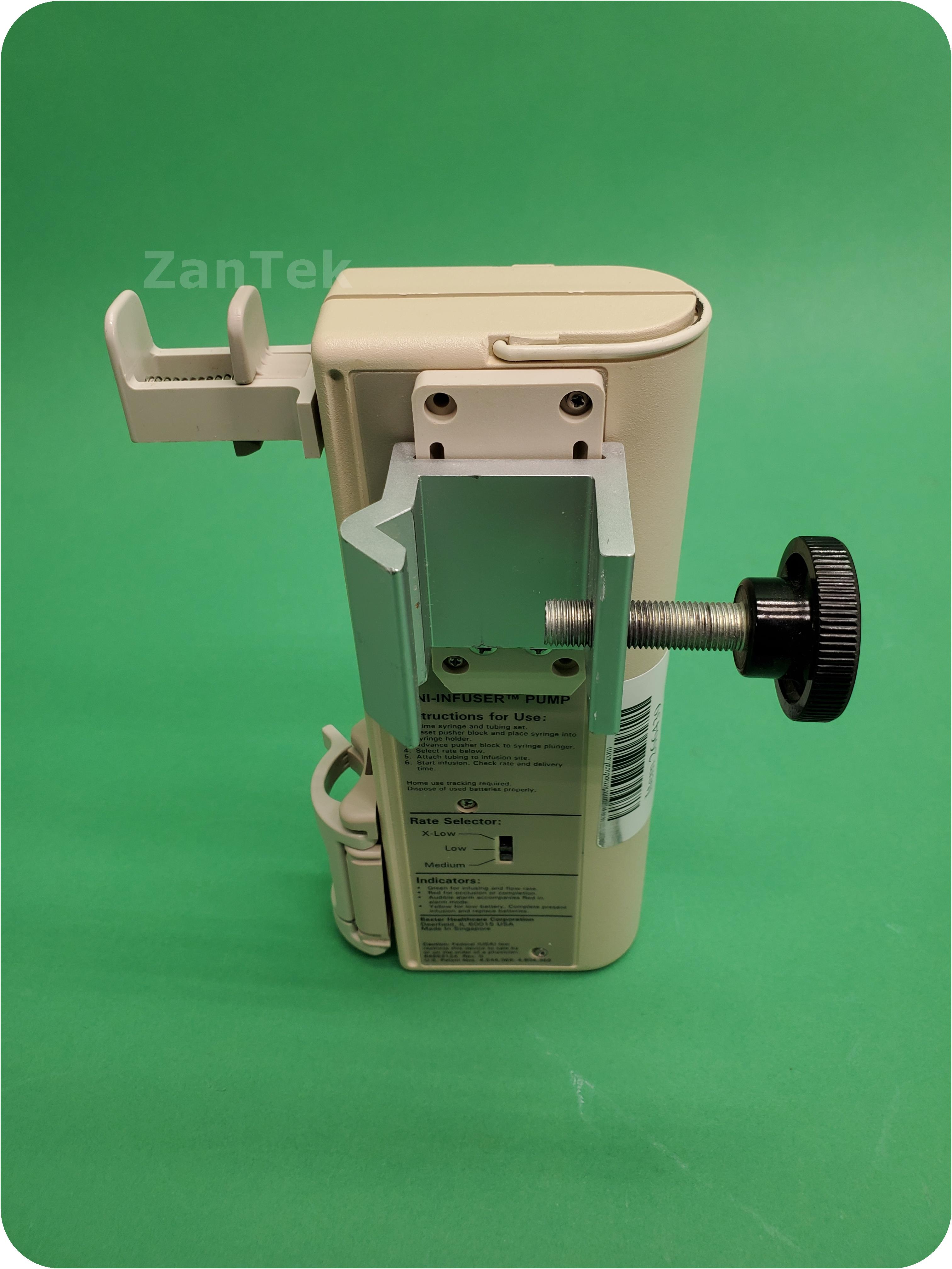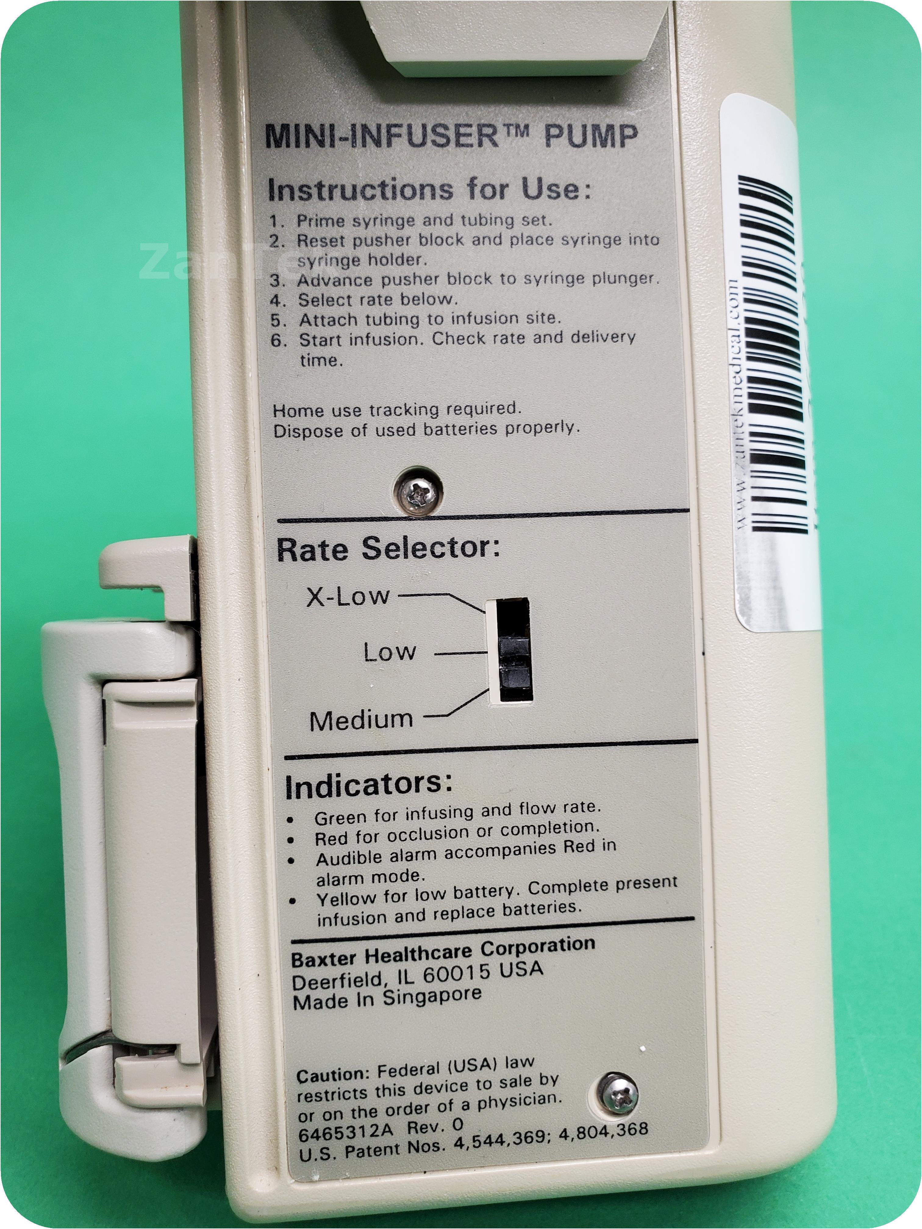 About Baxter 300XL Mini-Infuser: The Mini-InfuserTM System is designed for controlled intermittent administration of intravenous medication. The system includes standard disposable syringes, Microbore extension sets, and the Mini-InfuserTM 300XL syringe pump. This battery operated device provides ultimate control over both drug dosage and rate of administration. The Mini-InfuserTM System provides reproducible, defined drug infusion rates and, when used properly, is safe, dependable and practical.