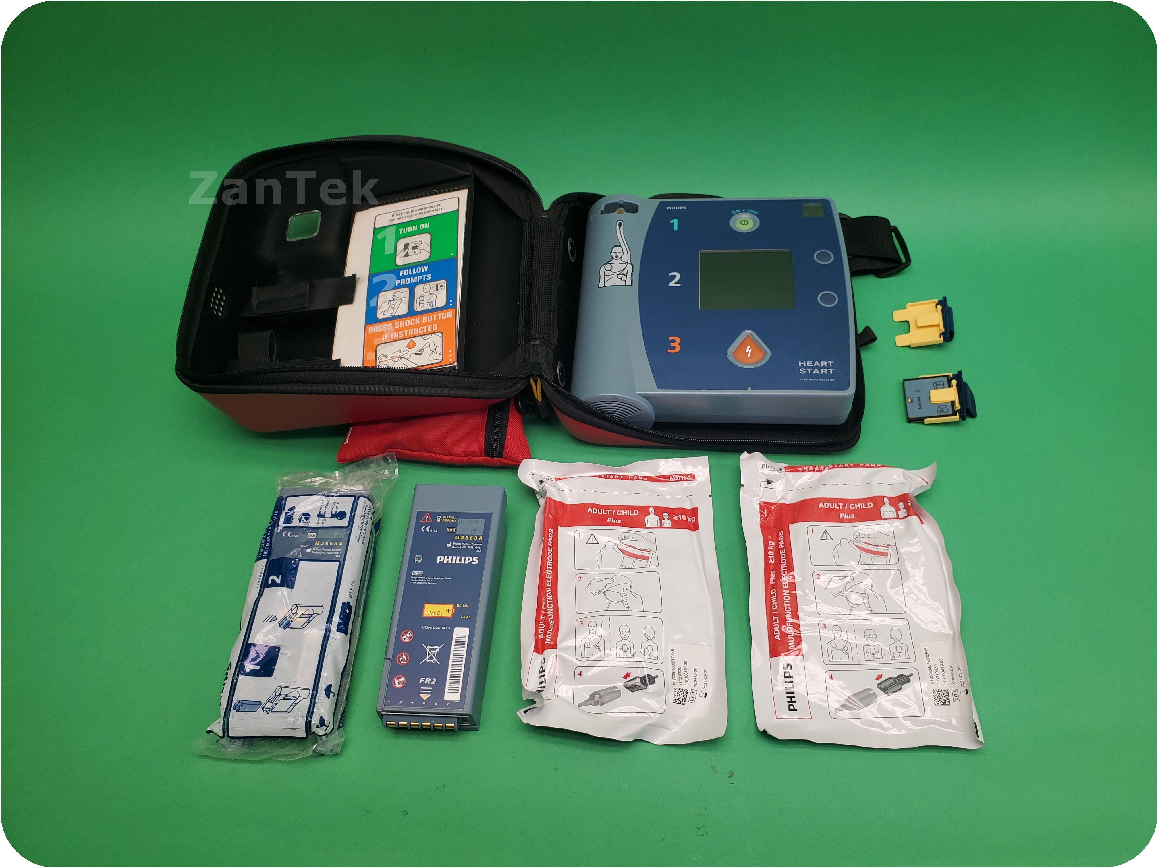 Includes data card (x2 data card slots), pads (x2), battery (x2), travel case and fast response kit.