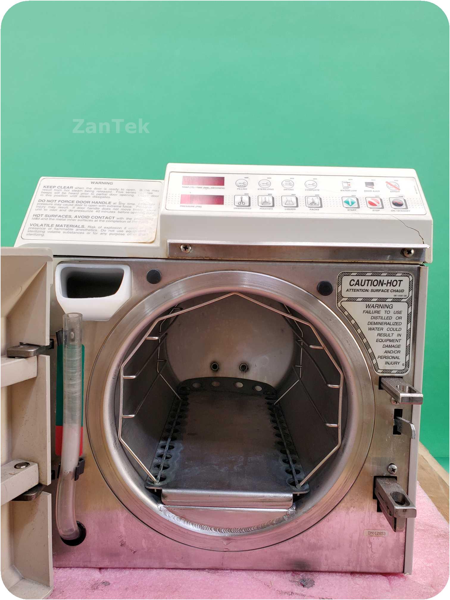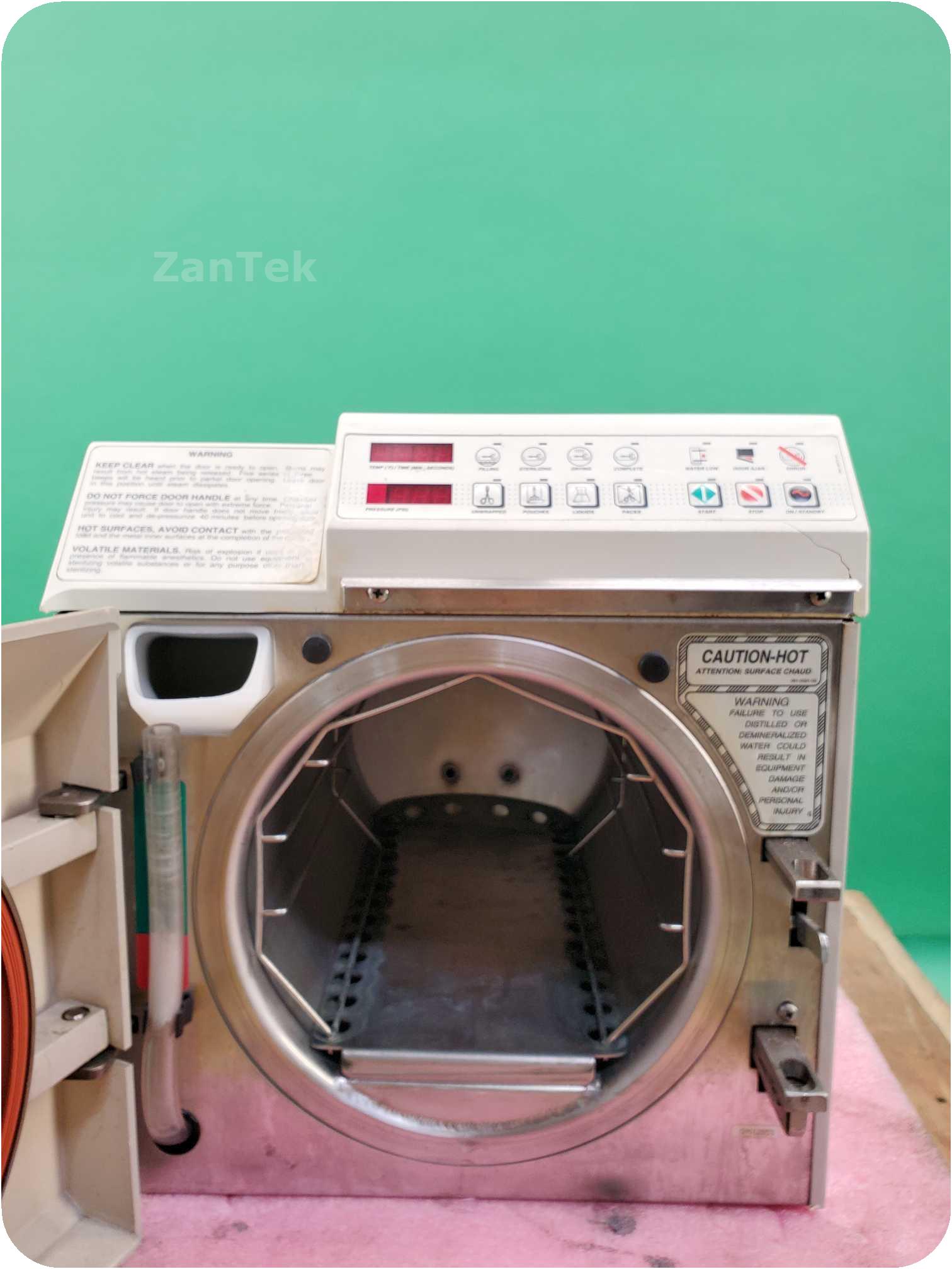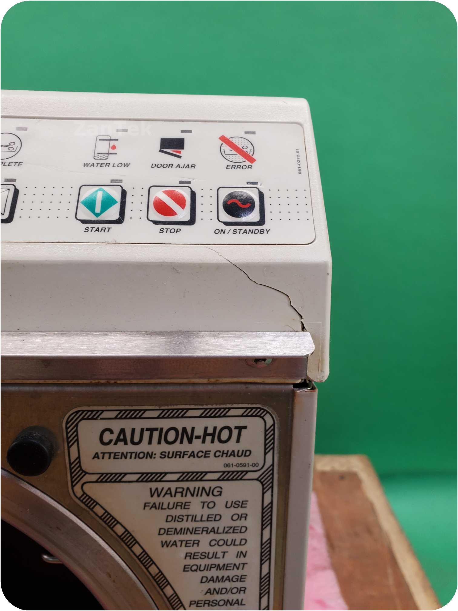 The sterilizer is in generally good condition, despite a crack below the control panel and a dent to the back, and fully functional.